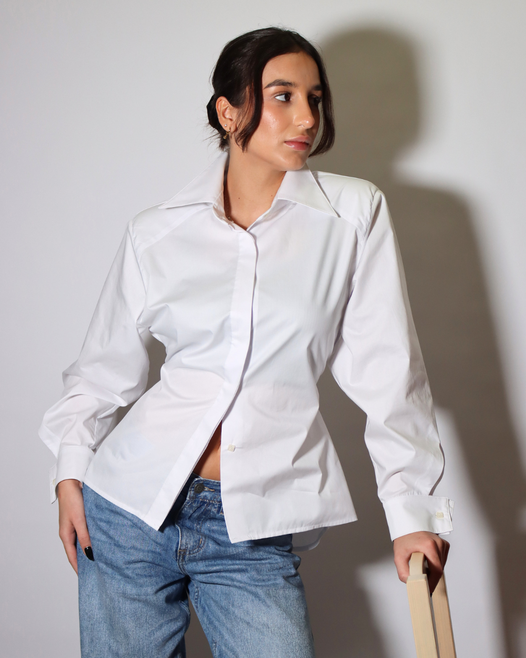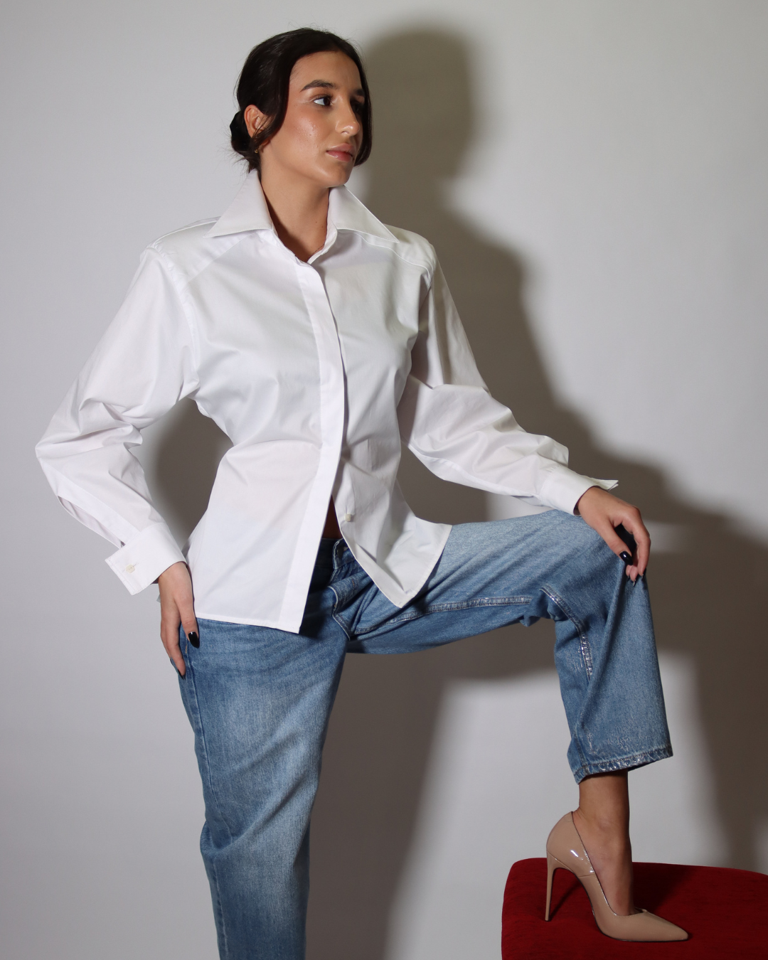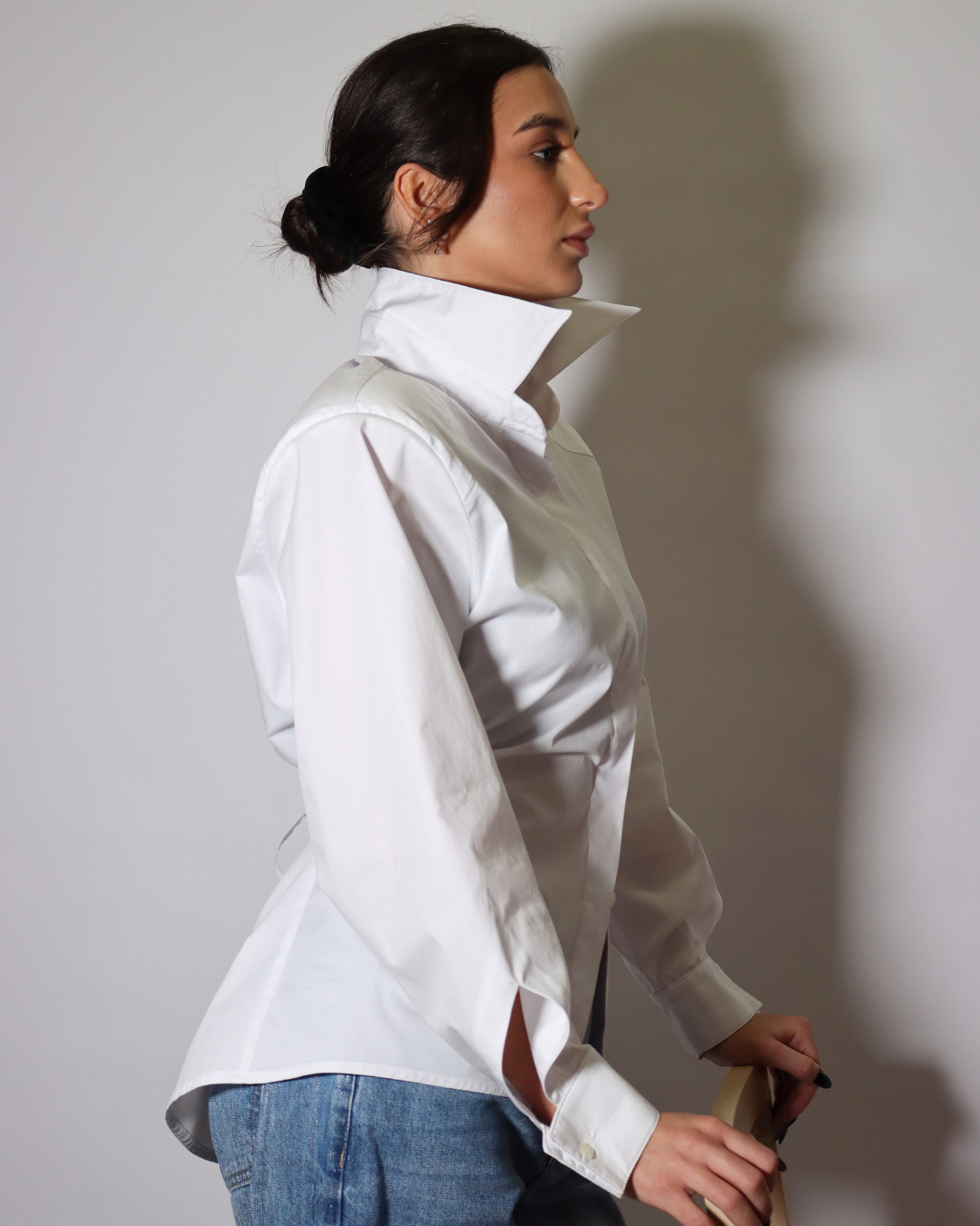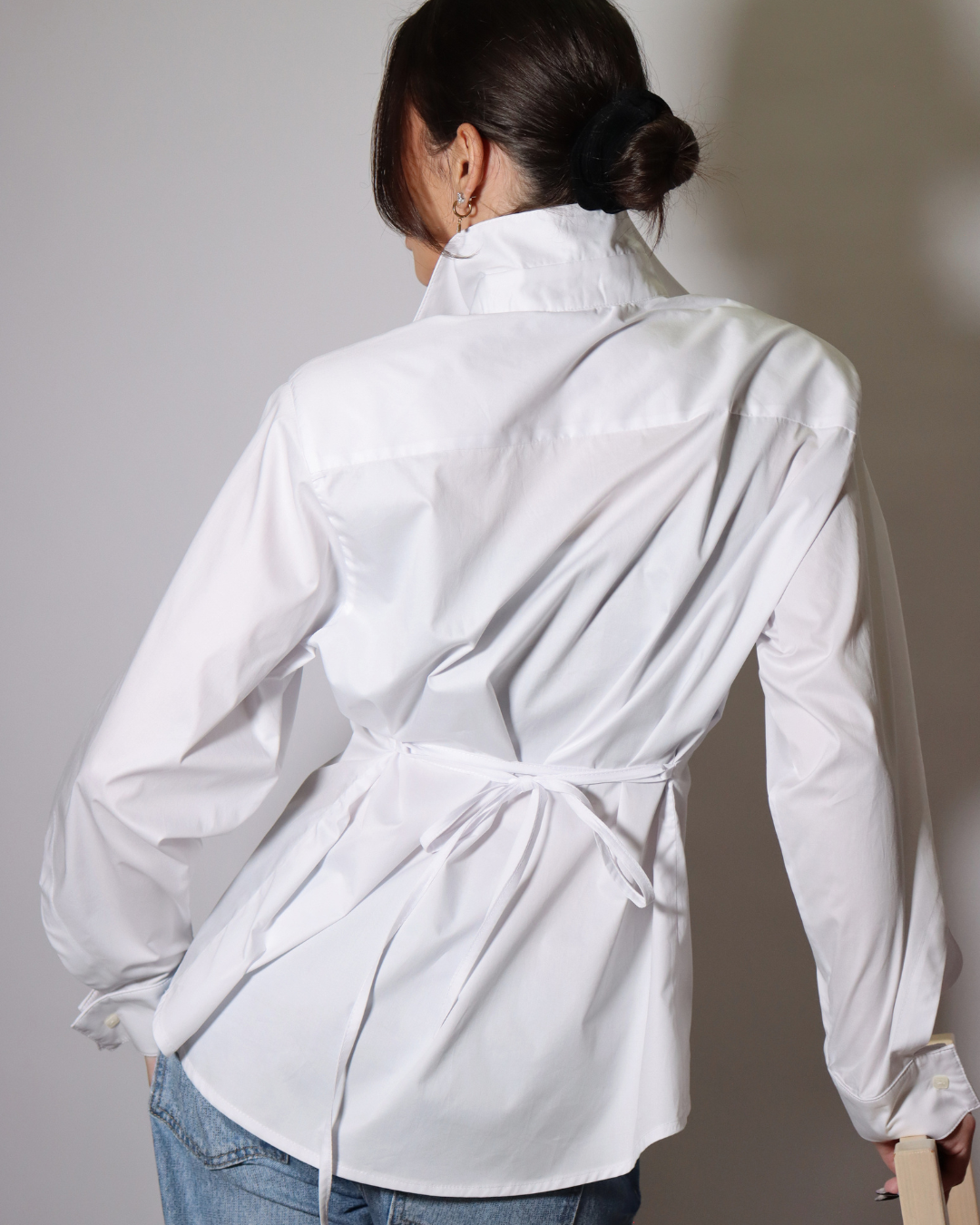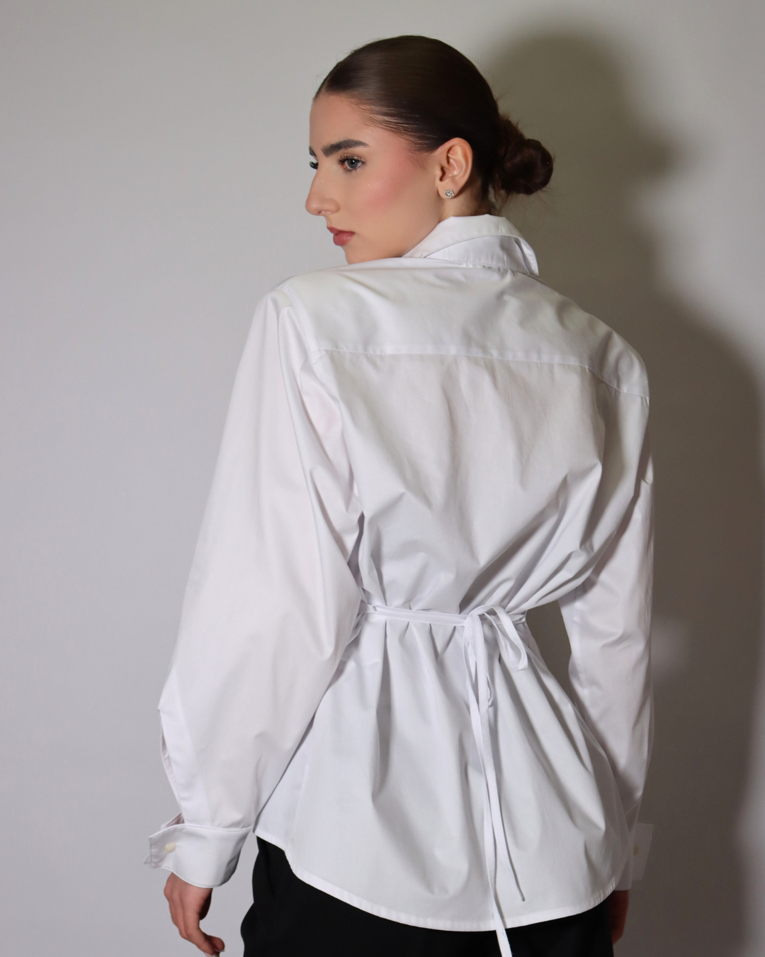Cămașa AVA are un croi drept și lejer, realizată din poplin de bumbac pentru confort și structură delicată. Mâneca lejeră, cu decupaj subtil lângă manșetă, și gulerul ascuțit elegant sunt completate de cordonul din talie, ce poate fi purtat liber sau legat în față ori la spate, evidențiind silueta într-un mod fluid și rafinat.