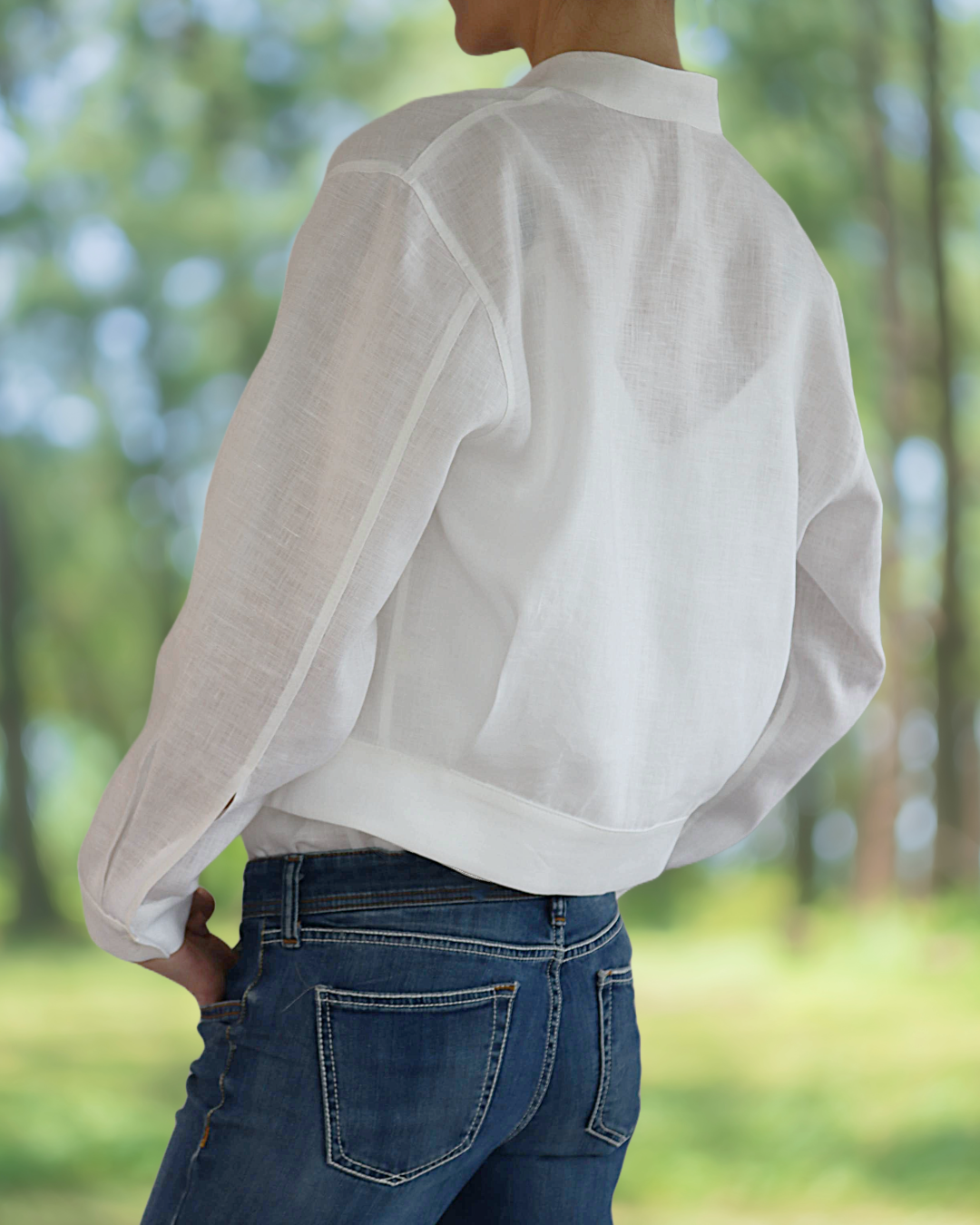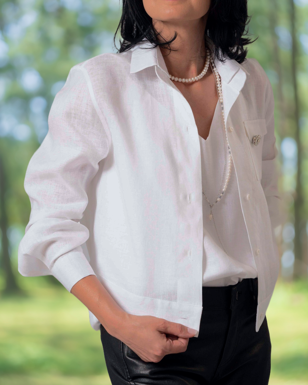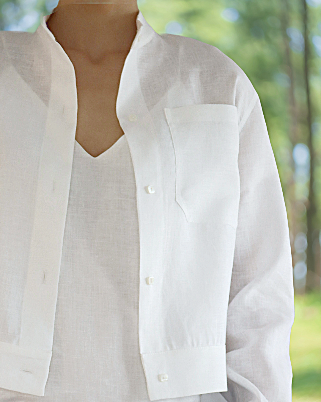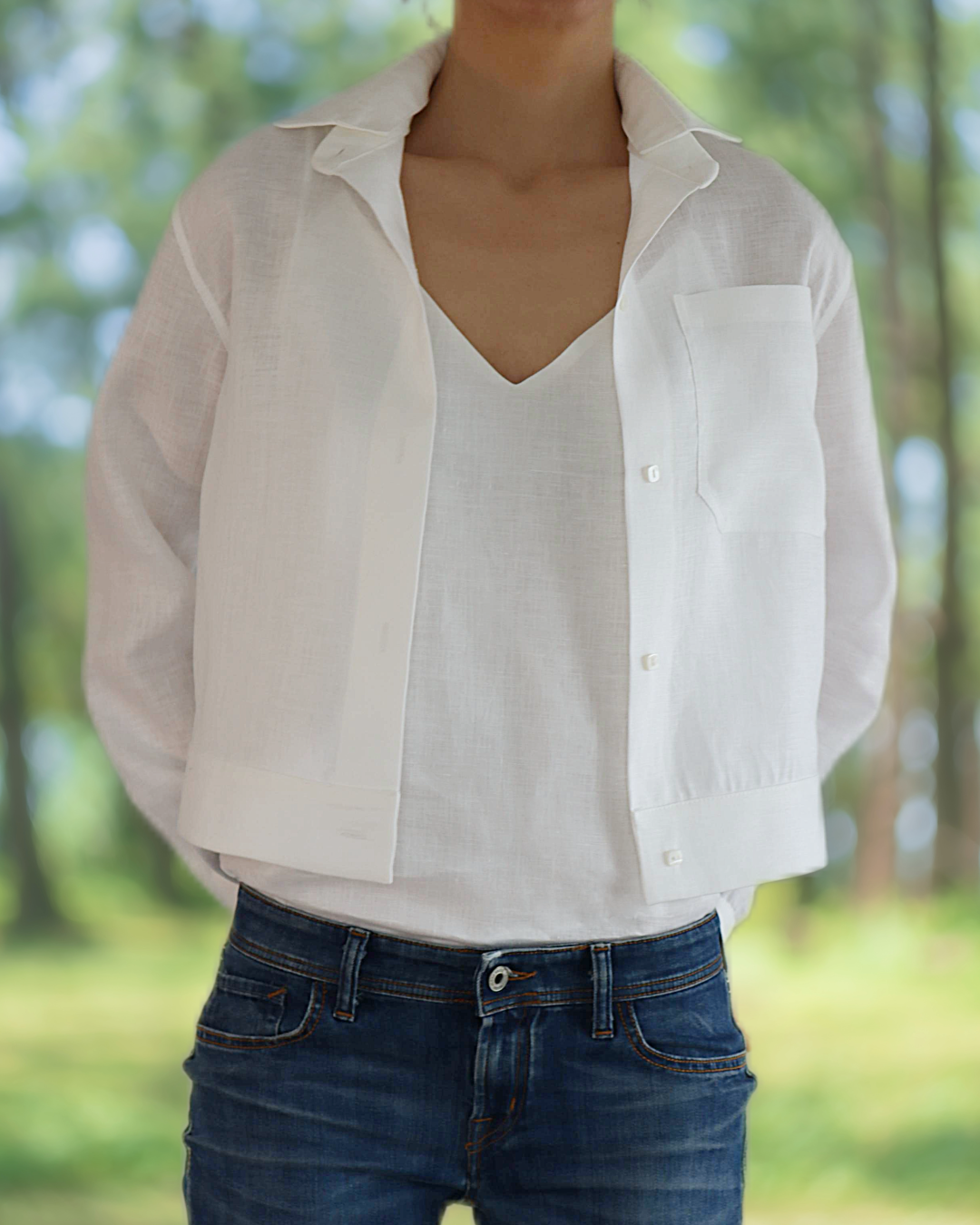 Cămașa ALLEGRA are o croială tip jachetă, cu o lungime scurtă și un guler dublu ce poate fi detașat ușor prin capse invizibile. Prin îndepărtarea gulerului, piesa se transformă într-o tunică modernă și minimalistă, ideală pentru ținute care combină eleganța cu funcționalitatea.