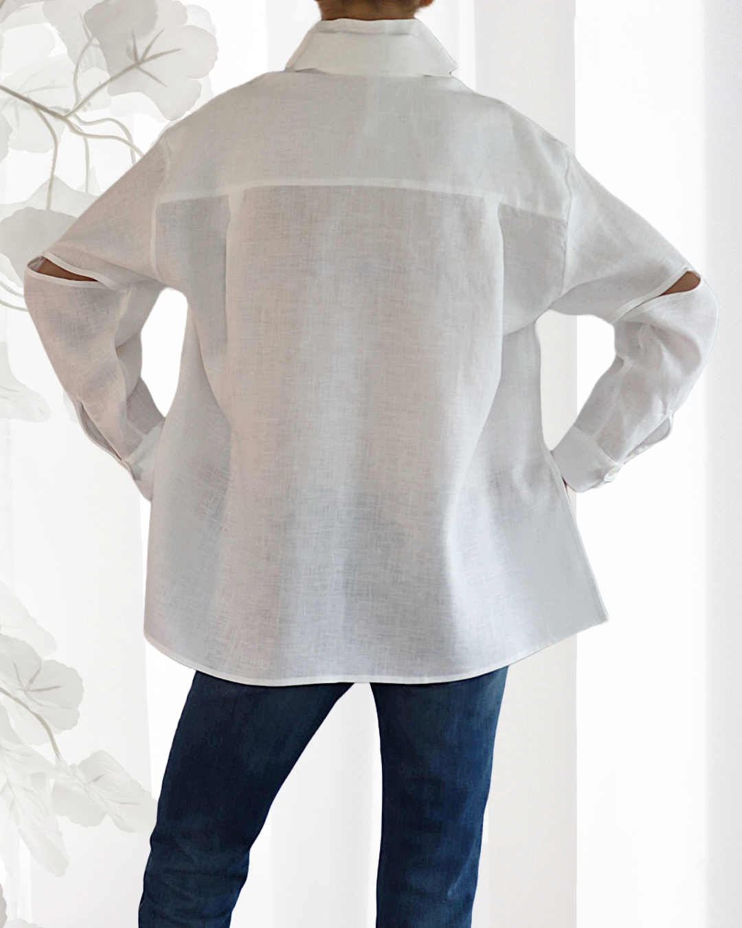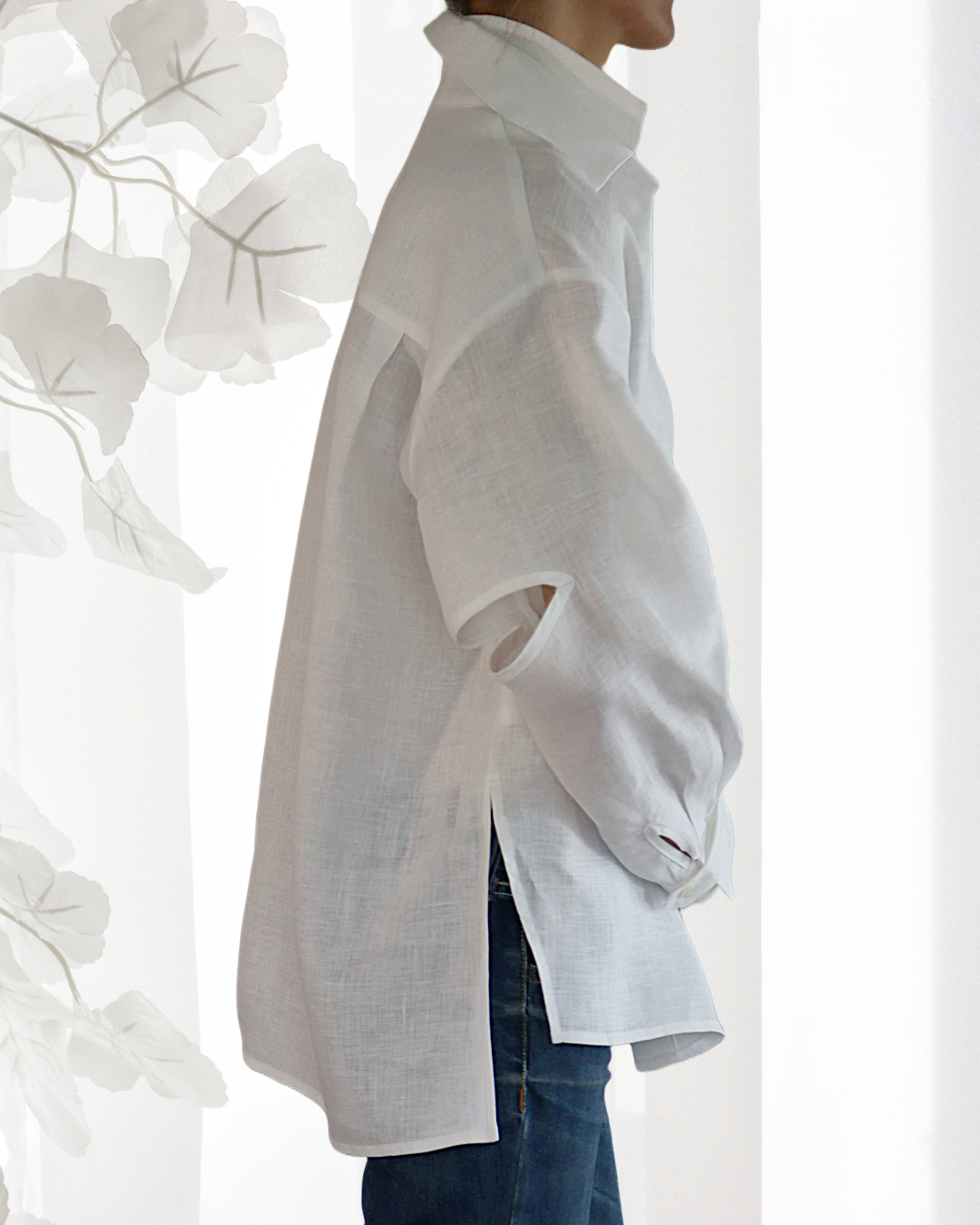 • Camasa din in alb, cu guler dublu si taietura pe maneca