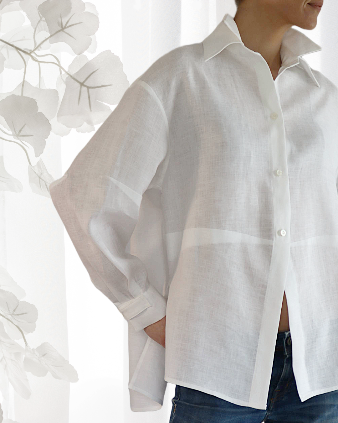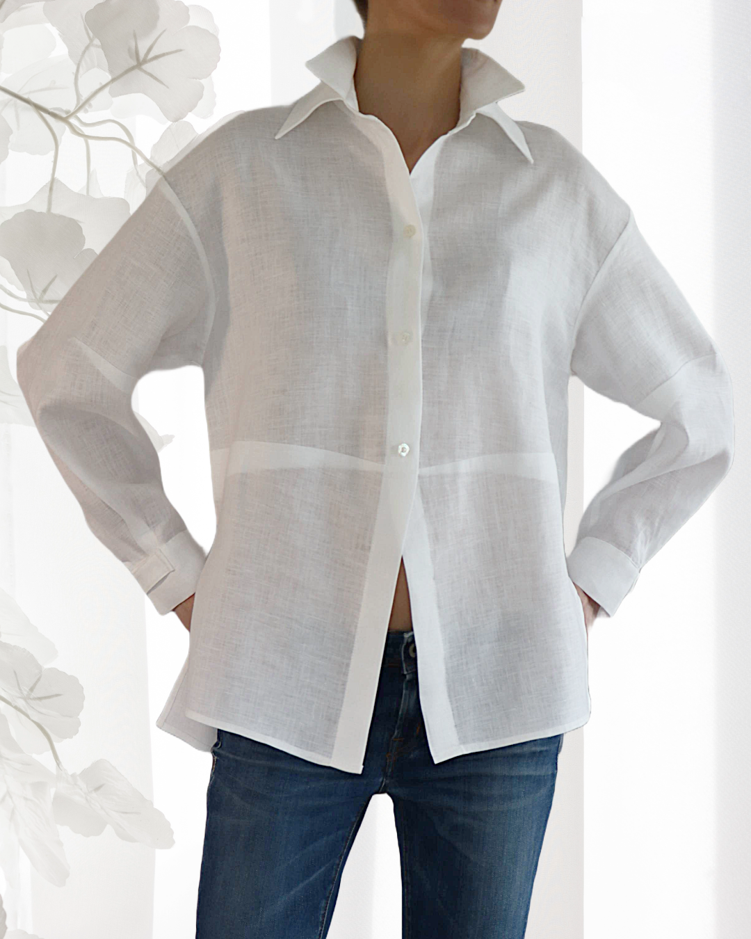 Cămașa GEORGIA îmbină o croială lejeră cu accente moderne — despicătura elegantă la cot și tăietura frontală în formă de V care subliniază linia corpului. Mansetele sunt accentuate printr-un detaliu fin și discret, adăugând o notă de eleganță naturală ținutei casual.